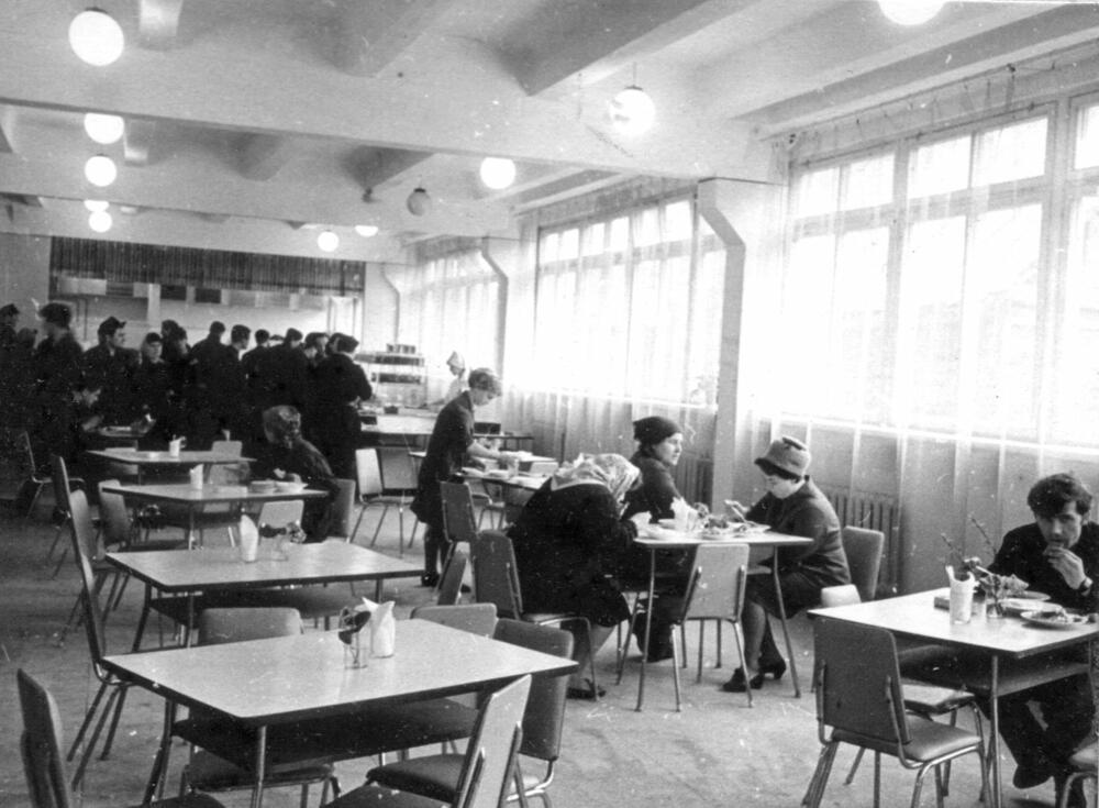 Rīgas ķīmiskās mašīnbūves rūpnīca "Rigahimmaš". Sabiedriskās ēdināšanas uzņēmuma apmeklētāji pusdienlaikā.