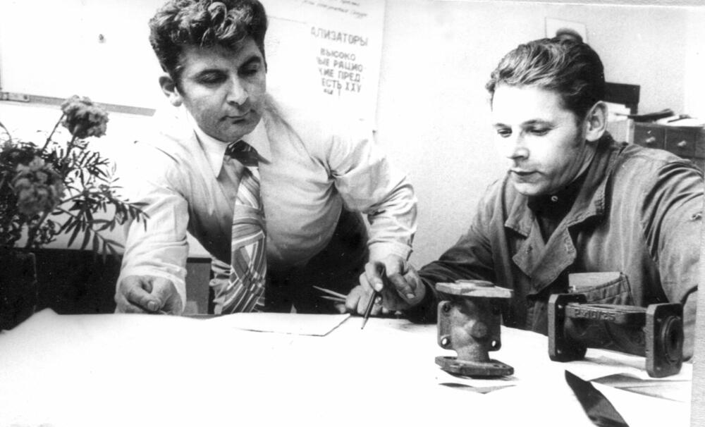 Rīgas ķīmiskās mašīnbūves rūpnīca "Rigahimmaš". Uzņēmuma ražošanas novatoru biroja vadītājs A. Tarnaruckis (no kreisās) un ceha Nr. 4 tehnologs J. Lūsis darba laikā.