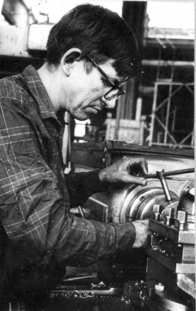 Rīgas ķīmiskās mašīnbūves rūpnīca "Rigahimmaš". Mehāniskā un montāžas ceha virpotājs, Darba Sarkanā Karoga ordeņa kavalieris Eduards Prohorovs darba laikā.