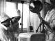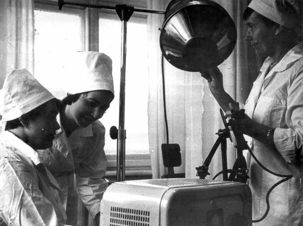 Ar Darba Sarkanā Karoga ordeni apbalvotās Rīgas ķīmiskās mašīnbūves rūpnīcas "Rigahimmaš" medpunkta personāls. No kreisās : medpunkta vadītāja T. Popova, feldšere N. Fedorova un daktere A. Dreiblate darba laikā.