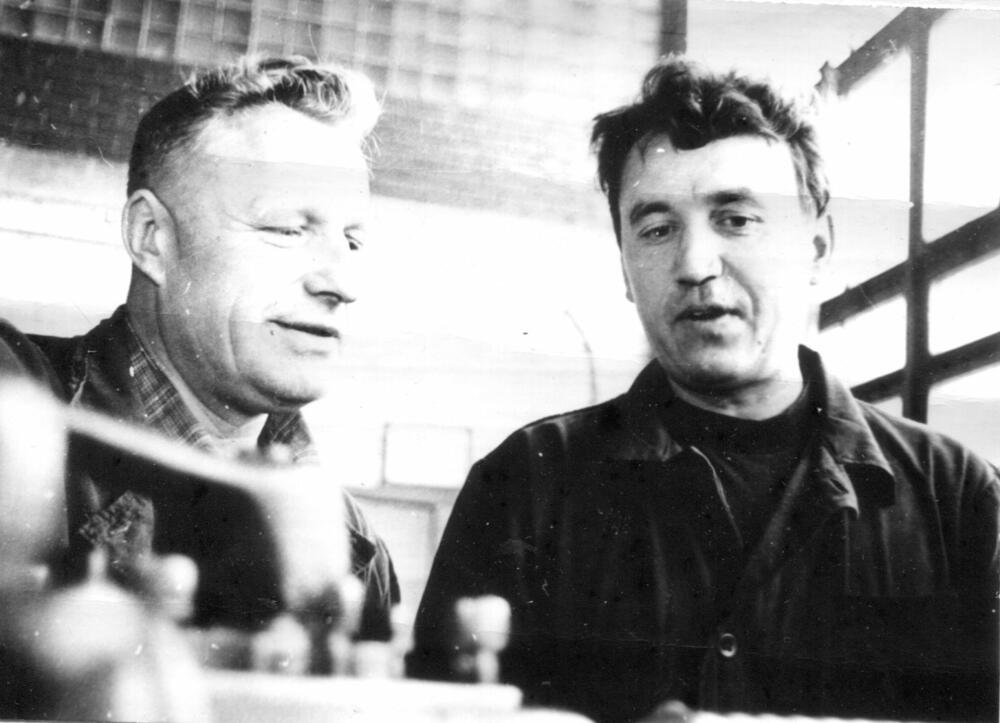 Rīgas ķīmiskās mašīnbūves rūpnīca "Rigahimmaš". Mehāniskā un montāžas ceha meistars, Goda Zīmes ordeņa kavalieris M. Pozņakovs (no kreisās) un virpotājs D. Ignatjevs darba laikā.
