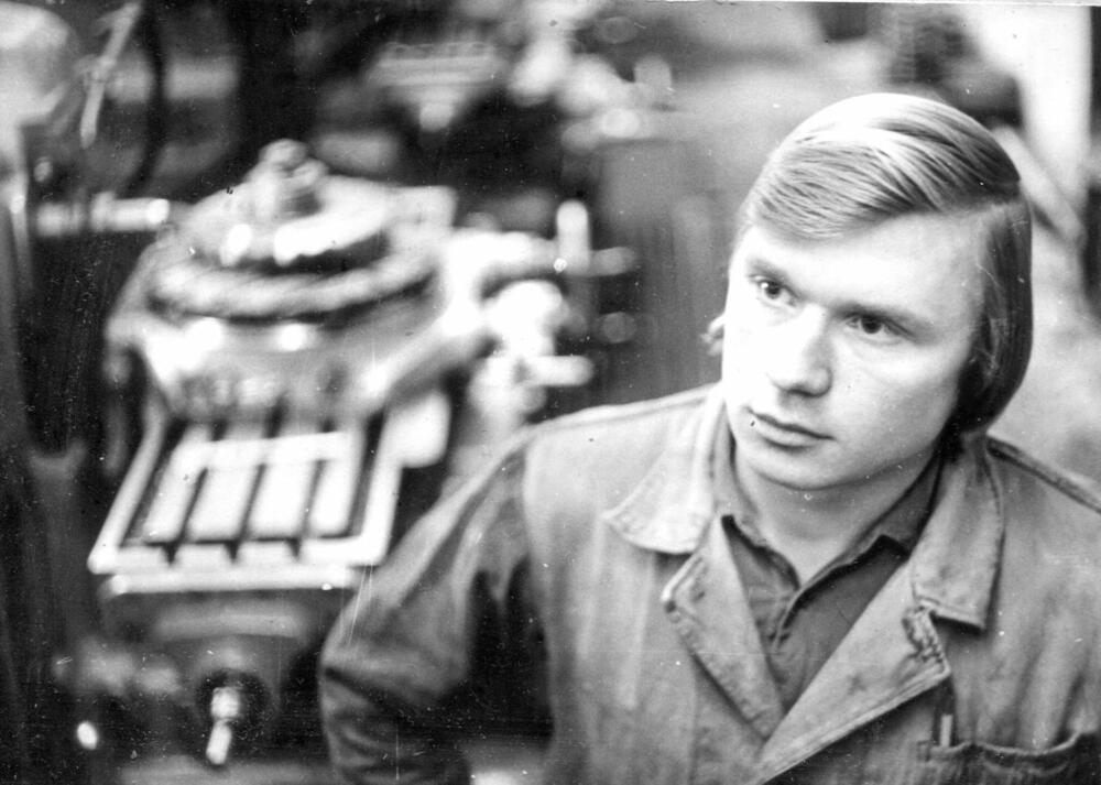 Rīgas ķīmiskās mašīnbūves rūpnīca "Rigahimmaš". Mehāniskā ceha frēzētājs, komunistiskā darba trieciennieks, komjaunatnes organizācijas sekretārs Jāzeps Stikuts darba laikā.