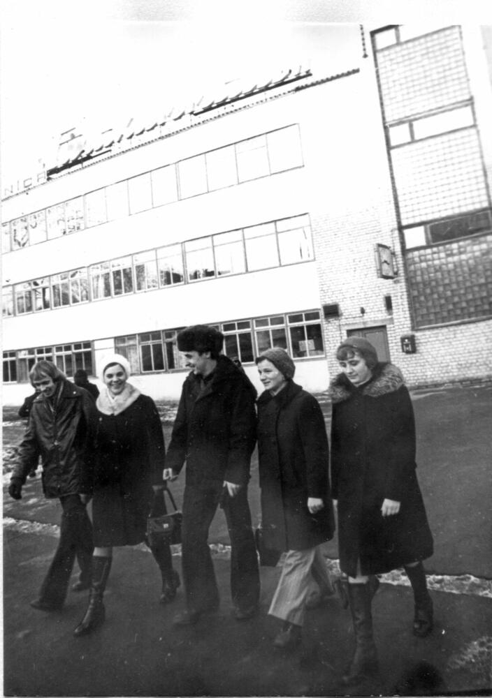 Ar Darba Sarkanā Karoga ordeni apbalvotās Rīgas ķīmiskās mašīnbūves rūpnīcas "Rigahimmaš" virpotāju brigāde uzņēmuma teritorijā. No kreisās : V. Ratikovs, E. Kovaļevska, A. Cingeļs L. Koloskova un V. Zaharova.