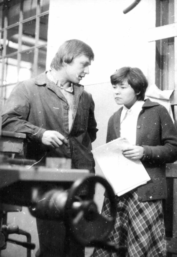 Ar Darba Sarkanā Karoga ordeni apbalvotā Rīgas ķīmiskās mašīnbūves rūpnīca "Rigahimmaš". Energomehāniskās apkalpes iecirkņa komjaunatnes organizācijas sekretārs J. Stikuts un iecirkņa komjaunatnes organizācijas sekretāra vietniece A. Baruško sarunas laikā.
