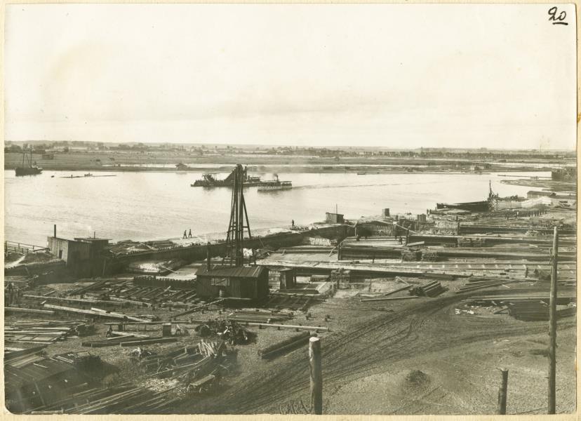 Skats uz "Cīzes kuģu būvētavas" ("Ziese Mühlgraben-Werft", saukta arī "F. Šichau Mīlgrāvja kuģu būvētava") celtniecības teritoriju, kur tiek veikti ierīkošanas darbi - stāpeļu ielikšana. Kuģu būvētavu 1913. gadā izveidoja Karls Henrihs Cīze (Carl Heinrich Ziese) kā Vācijas kuģu būvētavas "Schichau-Werke" meitas uzņēmumu ar mērķi piekļūt Krievijas Impērijas ieroču tirgum būvējot galvenokārt karakuģus. 1915. gadā kuģu būvētava tika atsavināta un nonāca tiešā Krievijas Impērijas pārraudzībā. Pēc Latvijas Republikas neatkarības proklamēšanas 1925. gada 11. maijā uz statūtu pamata, pārņemot Cīzes kuģu būvētavas uzņēmumu ar visu tam piederošo nekustamu un kustamu mantu, tika izveidota akciju sabiedrība "Mīlgrāvja kuģu būvētavas un mašīnu fabrika". Fonā redzama Daugava.