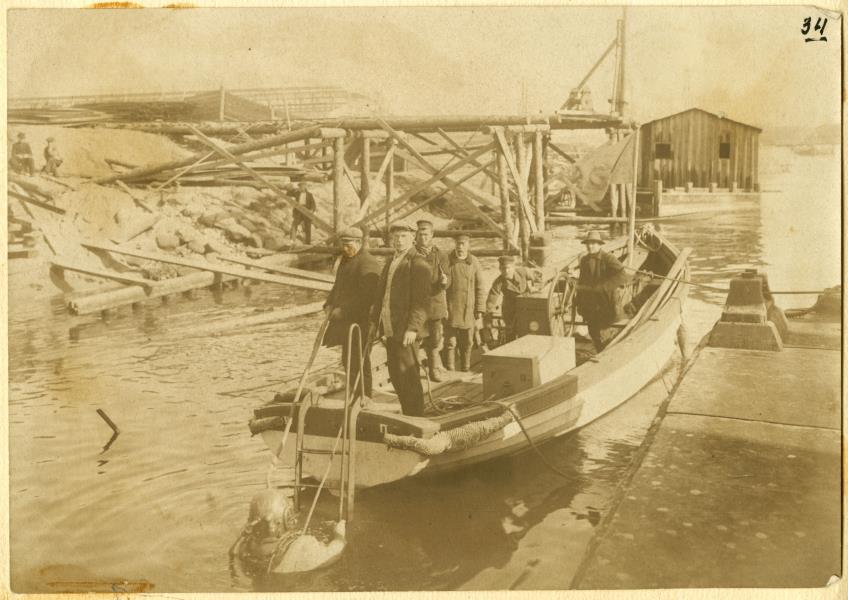 Ūdenslīdējs pie laivas, kurā stāv strādnieki, stāpeļu ceļu celtniecības laikā "Cīzes kuģu būvētavas" ("Ziese Mühlgraben-Werft", saukta arī "F. Šichau Mīlgrāvja kuģu būvētava") teritorijā. Kuģu būvētavu 1913. gadā izveidoja Karls Henrihs Cīze (Carl Heinrich Ziese) kā Vācijas kuģu būvētavas "Schichau-Werke" meitas uzņēmumu ar mērķi piekļūt Krievijas Impērijas ieroču tirgum būvējot galvenokārt karakuģus. 1915. gadā kuģu būvētava tika atsavināta un nonāca tiešā Krievijas Impērijas pārraudzībā. Pēc Latvijas Republikas neatkarības proklamēšanas 1925. gada 11. maijā uz statūtu pamata, pārņemot Cīzes kuģu būvētavas uzņēmumu ar visu tam piederošo nekustamu un kustamu mantu, tika izveidota akciju sabiedrība "Mīlgrāvja kuģu būvētavas un mašīnu fabrika".