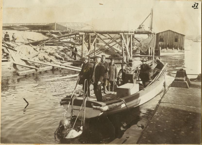 Ūdenslīdējs pie laivas, kurā stāv strādnieki, stāpeļu ceļu celtniecības laikā "Cīzes kuģu būvētavas" ("Ziese Mühlgraben-Werft", saukta arī "F. Šichau Mīlgrāvja kuģu būvētava") teritorijā. Kuģu būvētavu 1913. gadā izveidoja Karls Henrihs Cīze (Carl Heinrich Ziese) kā Vācijas kuģu būvētavas "Schichau-Werke" meitas uzņēmumu ar mērķi piekļūt Krievijas Impērijas ieroču tirgum būvējot galvenokārt karakuģus. 1915. gadā kuģu būvētava tika atsavināta un nonāca tiešā Krievijas Impērijas pārraudzībā. Pēc Latvijas Republikas neatkarības proklamēšanas 1925. gada 11. maijā uz statūtu pamata, pārņemot Cīzes kuģu būvētavas uzņēmumu ar visu tam piederošo nekustamu un kustamu mantu, tika izveidota akciju sabiedrība "Mīlgrāvja kuģu būvētavas un mašīnu fabrika".
