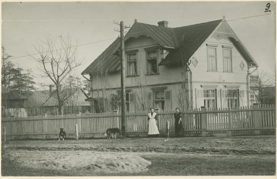 Skats uz dzīvojamo māju Mīlgrāvī. Uz ielas pie mājas stāv divas sievietes ar suņiem.