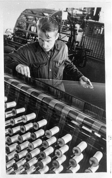 Fabrikas ''Rīgas audums'' vērptuves meistars, racionalizators Egons Riksis cehā.