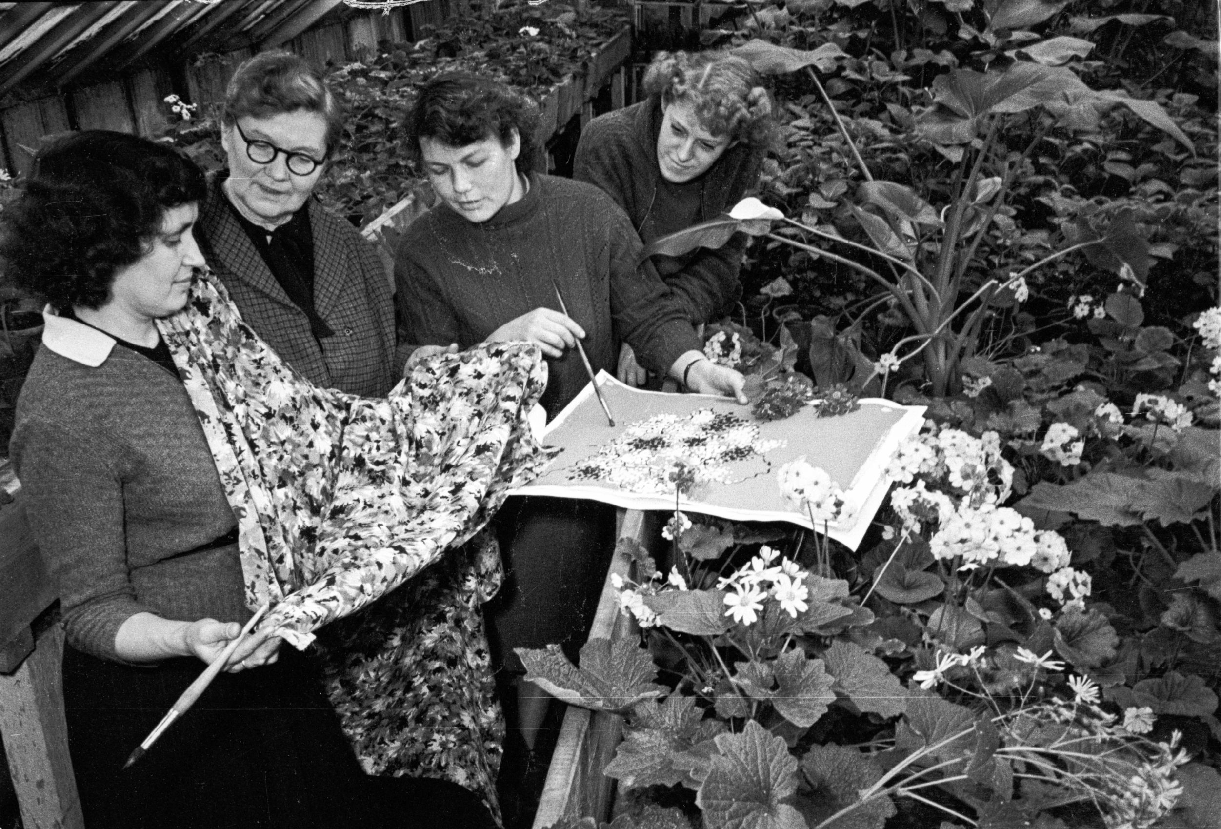 Kombināta “Rīgas audums” mākslinieces kombināta oranžērijā apspriež jauno audumu zīmējumus. No kreisās: 1. Ērika Iltnere, 2. galvenā māksliniece Kristīne Pāvuliņa, 3. Valija Apsane, 4. Estere Tartlane.