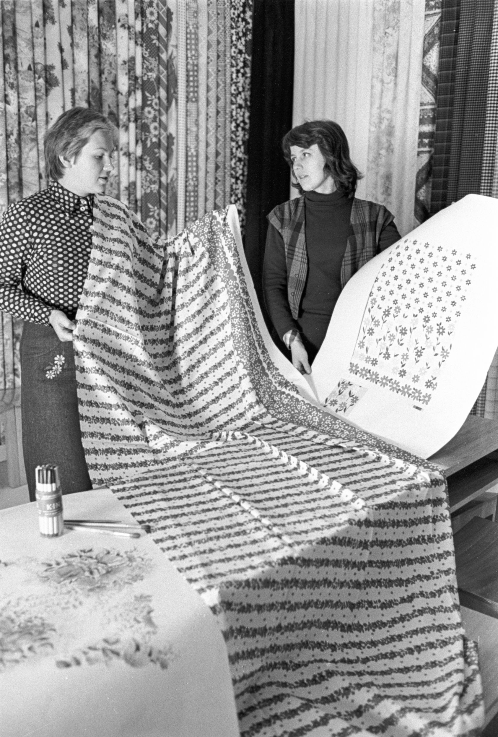 Ražošanas apvienības “Rīgas audums” mākslinieces Ārija Vītoliņa (no kreisās) un Aija Bušere aplūko, apspriež jauno zīda audumu un tā zīmējumus.