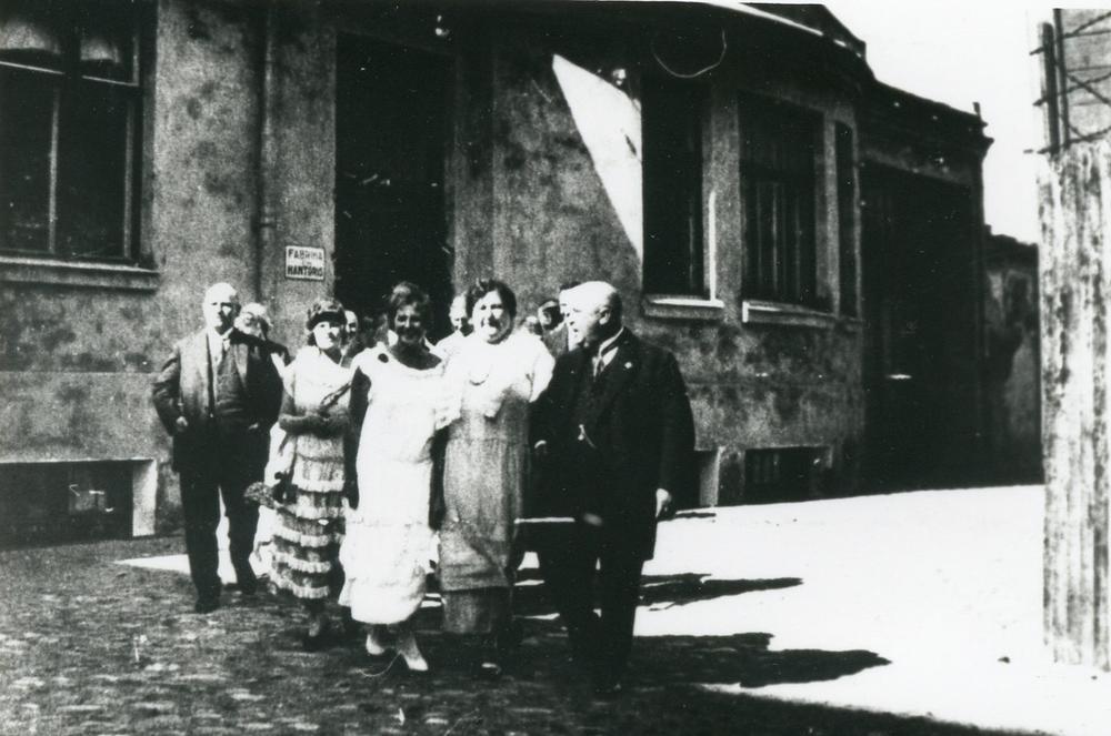 Skolotājs, uzņēmējs un saldumu fabrikas "V. Ķuze" īpašnieks Vilhelms Ķuze ar dzīvesbiedri Olgu un viesiem pie fabrikas administrācijas ēkas. No labās puses: 1. Vilhelms Ķuze, 2. Olga Ķuze (dzimusi Zeltiņa). Grupas foto.