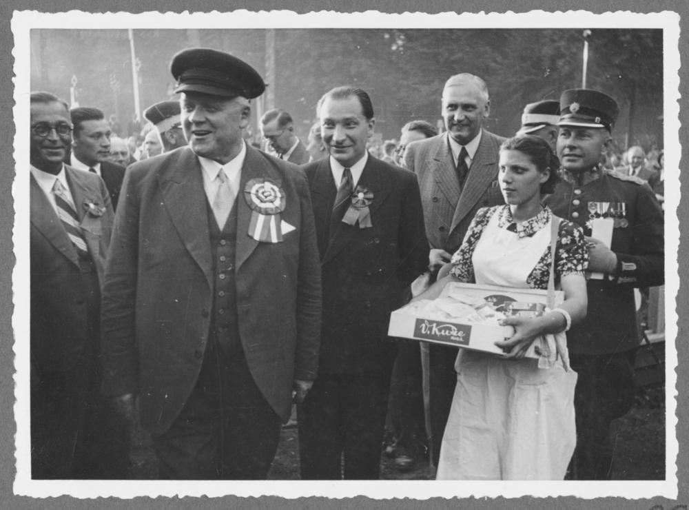 Pirmo Dziesmu svētku 75 gadu Atceres Dziesmu svētki Dikļu muižas parkā. No kreisās: 1. iekšlietu ministrs Kornēlijs Veitmanis (pēc 1940. gada Kornēlijs Veidnieks), 2. Latvijas Valsts un Ministru prezidents Kārlis Ulmanis, 3. sabiedrisko lietu ministrs Alfrēds Jēkabs Bērziņš, 4. "A/S Ķuze" pārstāve ar saldumiem.