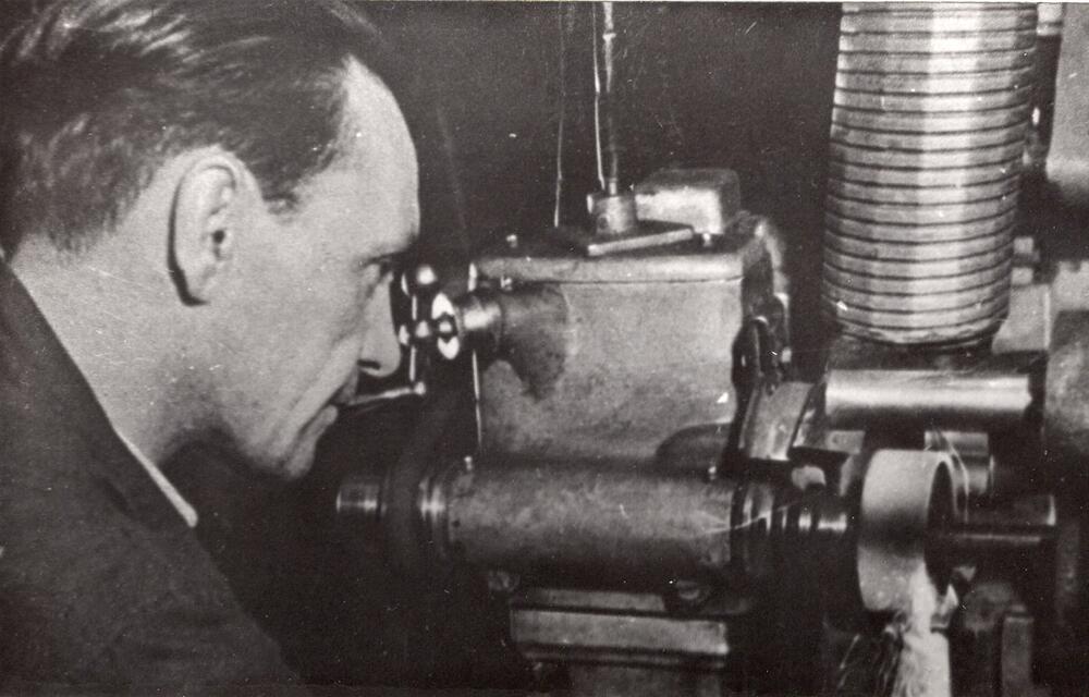 Valsts elektrotehniskās fabrikas (VEF) virpotājs, ražošanas pirmrindnieks Vladimirs Aleksejevs darba laikā.