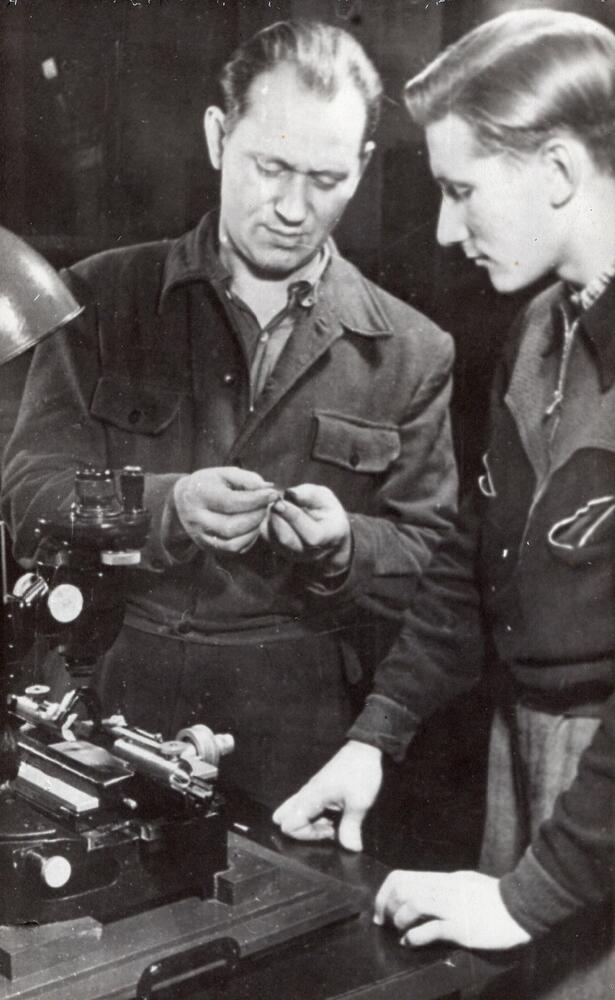 Valsts elektrotehniskās fabrikas (VEF) slīpētājs, ražošanas pirmrindnieks Villijs Berenfelds (no kreisās) ar dēlu Valdi pie darba galda.