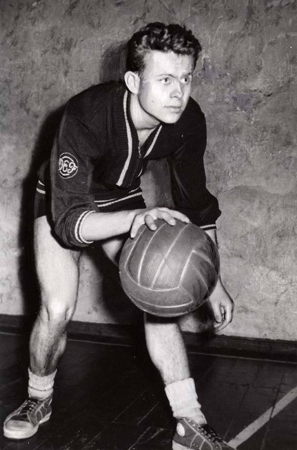 Rīgas elektrotehniskās rūpnīcas "VEF" 2. basketbola komandas spēlētājs Staņislavs Jaglinskis treniņa laikā. Portrets.
