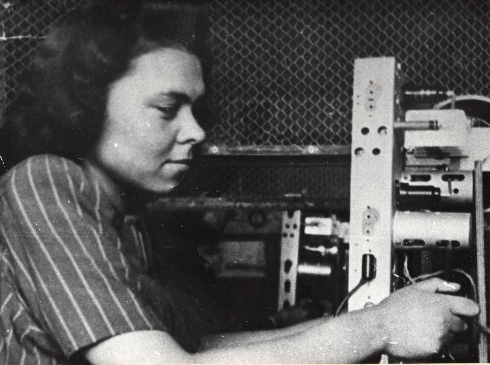 Valsts elektrotehniskās fabrikas (VEF) ražošanas pirmrindniece Valentīna Valeine darba laikā.