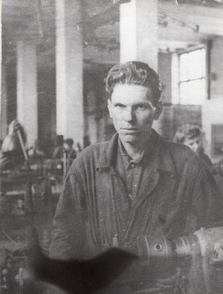 Valsts elektrotehniskās fabrikas (VEF) mehāniskā ceha darba pirmrindnieks, ražošanas novators Nikolajs Sotinovs pie darba galda.