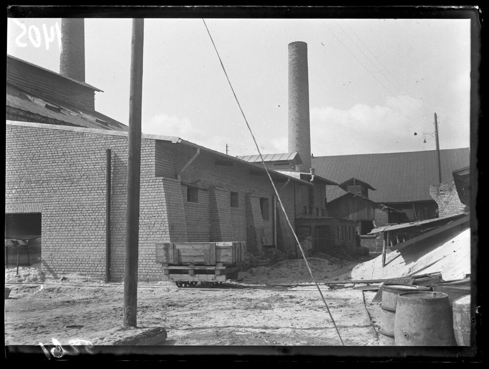 Stikla fabrikas "Emolips" teritorijas daļa Sliežu ielā 6. Priekšplānā uz sliedēm stāv vagonete.