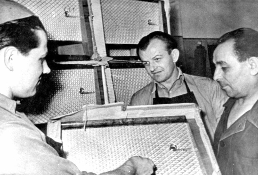 Valsts elektrotehniskās fabrikas (VEF) radio korpusu montāžas ceha lakošanas iecirkņa brigāde. No kreisās: brigadieris V. Bankovičs, montieri J. Tenis un M. Tatulovs darba laikā.