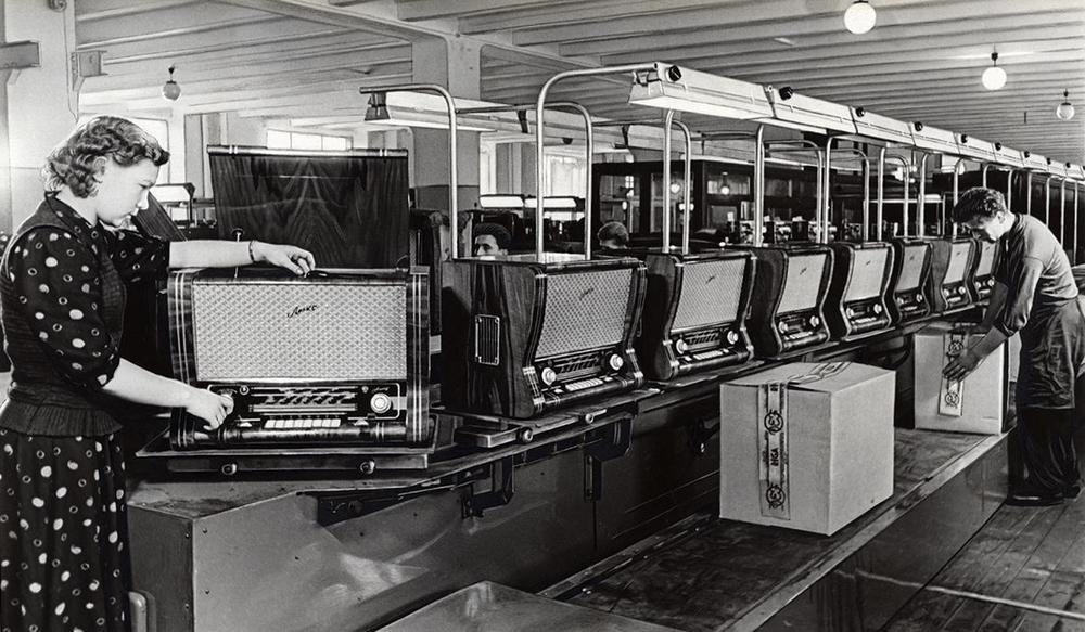 Rūpnīcas "VEF" gatavo radiolu “Lukss” konveijers. Pa jauno ķēdes konveijeru tās nonāk pie kontroliera un noslēgumā pie iesaiņotāja. Radiola "Lukss" tikusi izstrādāta 1955. gadā un tās dizaina autors bija Ādolfs Irbīte. Radiolas "Lukss" tikušas ražotas no 1956. - 1958. gadam.
