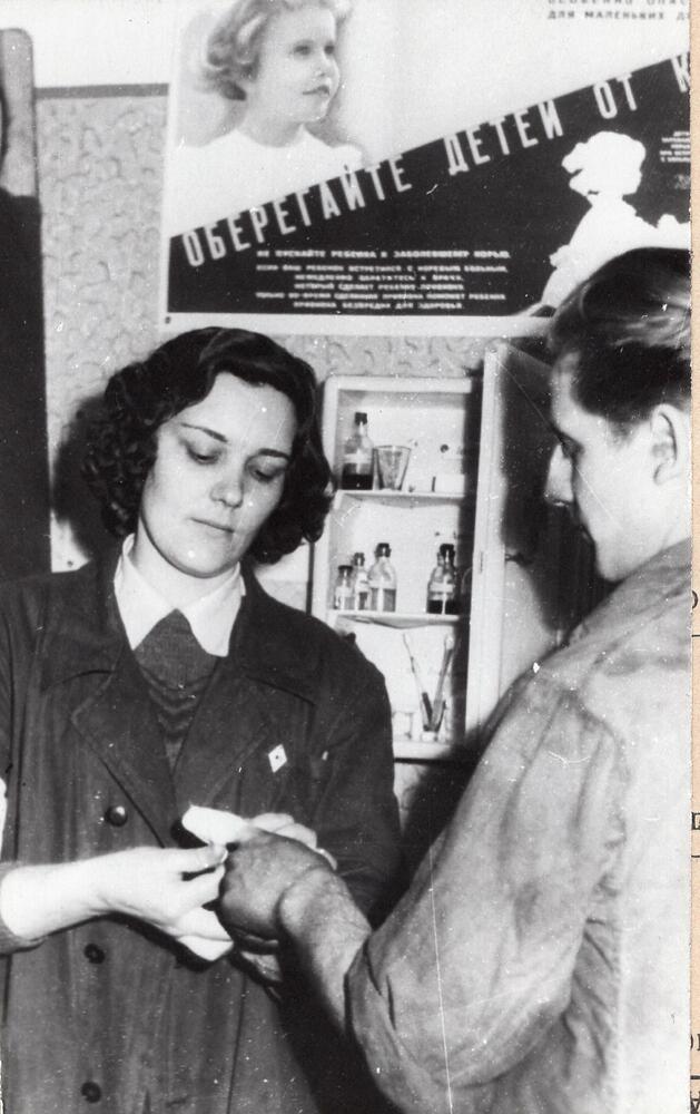 Valsts elektrotehniskā fabrika (VEF). 10. ceha medpunkta vadītāja Skujiņa sniedz pirmo medicīnisko palīdzību uzņēmuma darbiniekam.