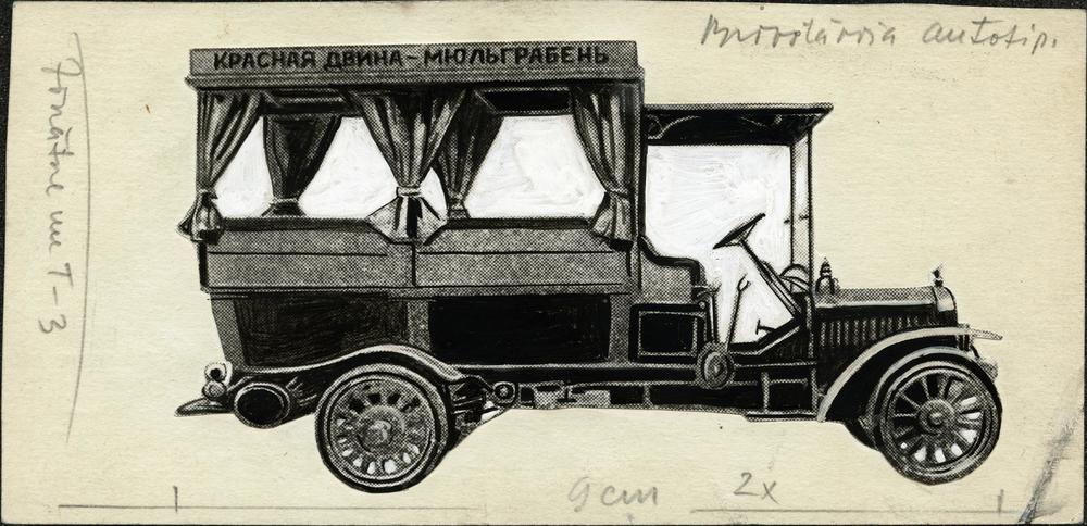 Krievu-Baltijas vagonu rūpnīcā izgatavotais omnibusa "Rosso-Balt" M24-35 modelis. Norāde uz omnibusa liecina, ka auto kursē maršrutā "Sarkandaugava - Mīlgrāvis". Fotokopija.