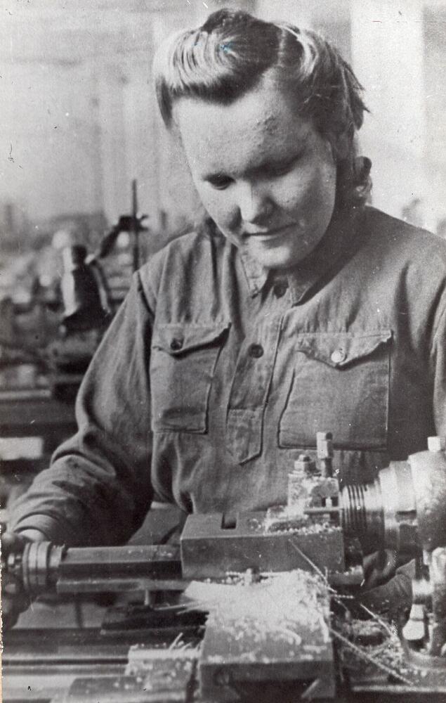 Valsts elektrotehniskās fabrikas (VEF) virpotāja, ražošanas pirmrindniece Baumane pie darba galda.