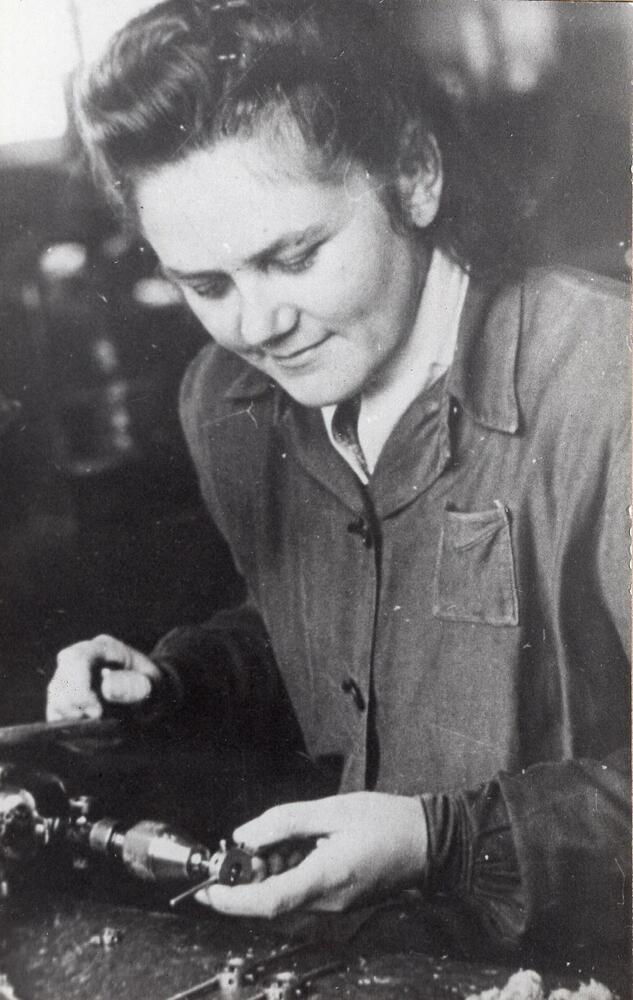 Valsts elektrotehniskā fabrika (VEF). Instrumentālā ceha kalibrētāja, ražošanas pirmrindniece Olga Jākobsone pie darba galda.