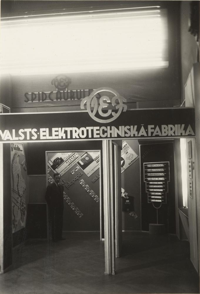 Valsts elektrotehniskās fabrikas jeb "VEF"stends, kas apgaismots ar neona spuldzēm 16 dažādās krāsās, Latvijas Tirdzniecības un rūpniecības kameras rīkotajā izstādē “Biroja iekārta un veikala reklāma”.