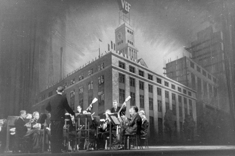 Rūpnīcas "VEF" mākslinieciskās pašdarbības mūzikas kolektīva priekšnesums, Republikāniskās mākslinieciskās pašdarbības skates laikā, Latvijas PSR Centrālās arodbiedrības padomes (ACP) Centrālajā strādnieku klubā (tagad Mazā Ģilde) Amatu ielā 5.