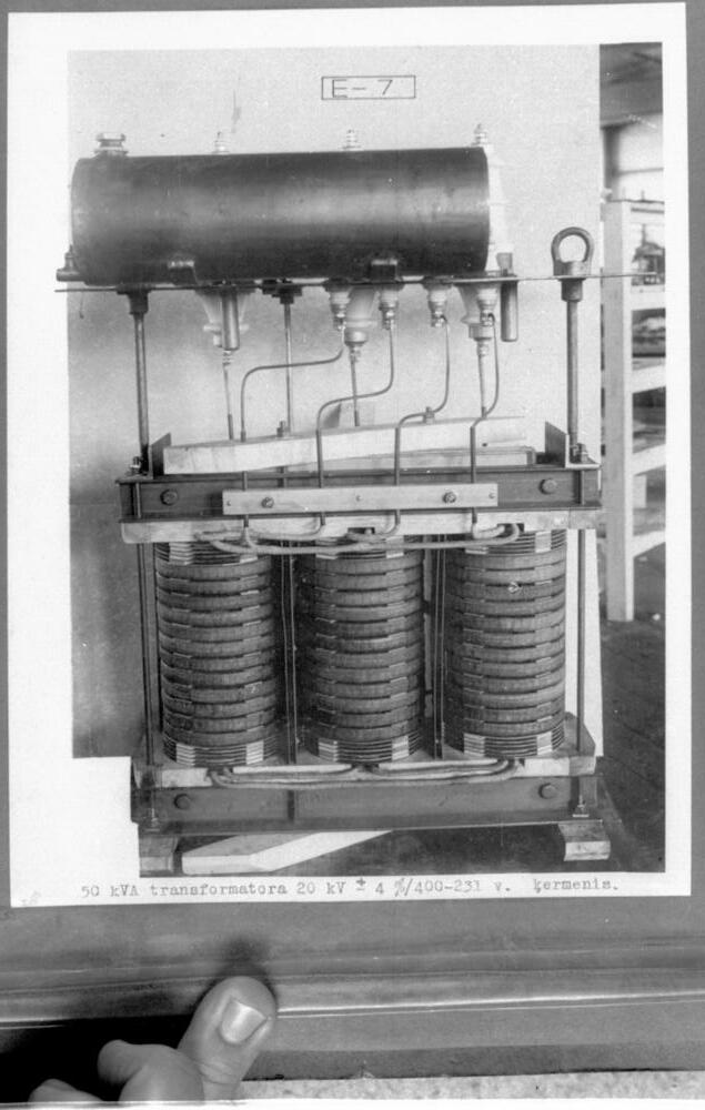 Valsts elektrotehniskajā fabrikā (VEF) ražotā 50 kVA transformatora serde, 20 kV +/- 4%, 400-231 V.