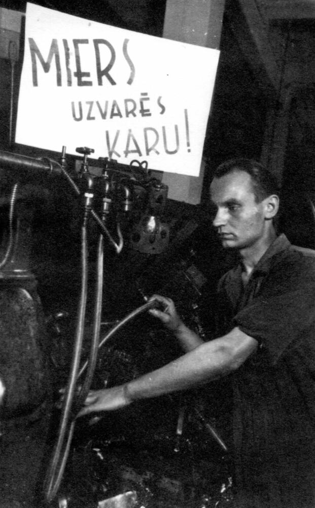 Rīgas eksperimentālās rūpnīcas "Stars" montieris Arvīds Zvaigznīte darba laikā. Savus dienas uzdevumus sistemātiski veic ar 200 % lielu uzviju.