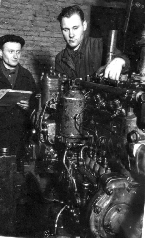 Rīgas eksperimentālā rūpnīca "Stars". Tehniskās kontroles nodaļas vecākais meistars M. Gurevičs (no kreisās) un montieris A. Sudmalis veic traktora dzinēja tehniskā stāvokļa kontroli.