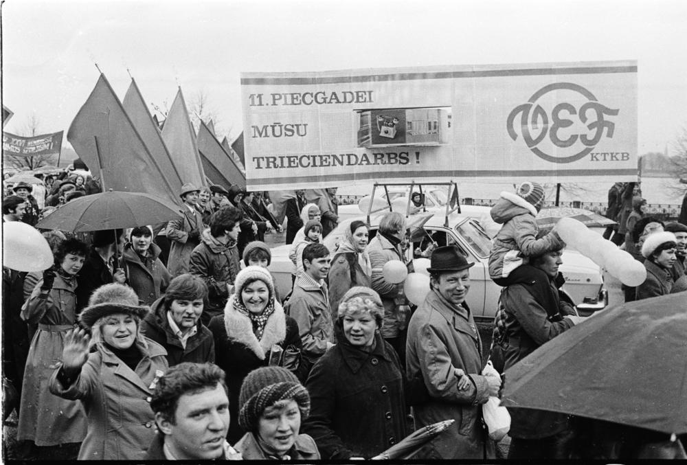 Valsts elektrotehniskās fabrikas (VEF) darbinieki Pirmā maija svētku darbaļaužu demonstrācijā.