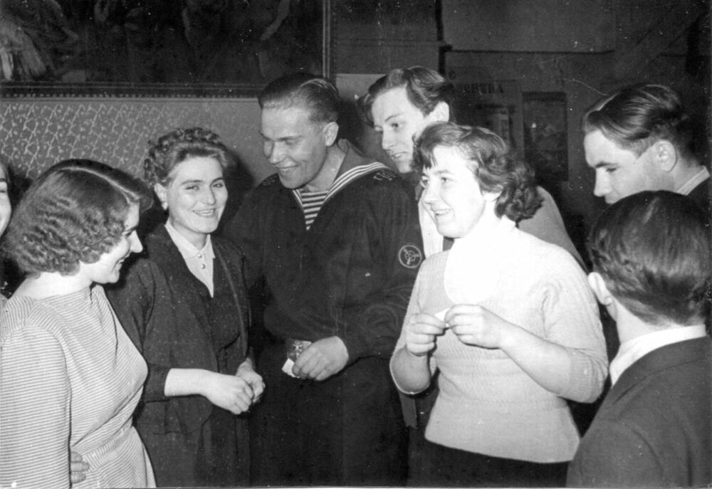 Valsts elektrotehniskās fabrikas (VEF) kolektīvs uzņēmuma Kultūras pilī. Tikšanās ar Černomorskas flotes karakuģa vecāko matrozi O. Ginteru (centrā).