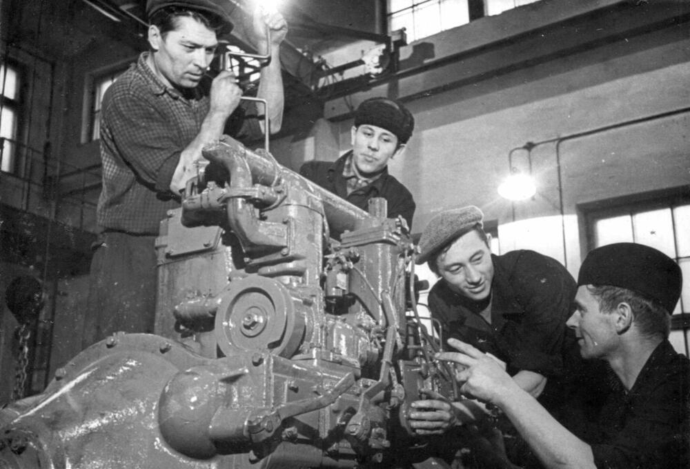 Rīgas eksperimentālās rūpnīcas "Stars" atslēdznieku brigāde veic traktoru "DT - 54" dzinēja montāžu. No kreisās : Mihails Kostins, Georgijs Nikolejevs, brigadieris Boriss Kuzņecovs un Aleksandrs Daņiļenko.