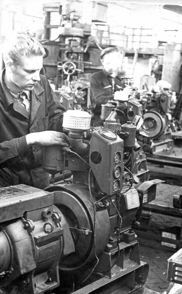 Rīgas eksperimentālās rūpnīcas "Stars" atslēdznieki I. Piņčuks (no kreisās) un I. Patarovičs veic pārvietojamu elektrostaciju montāžu.