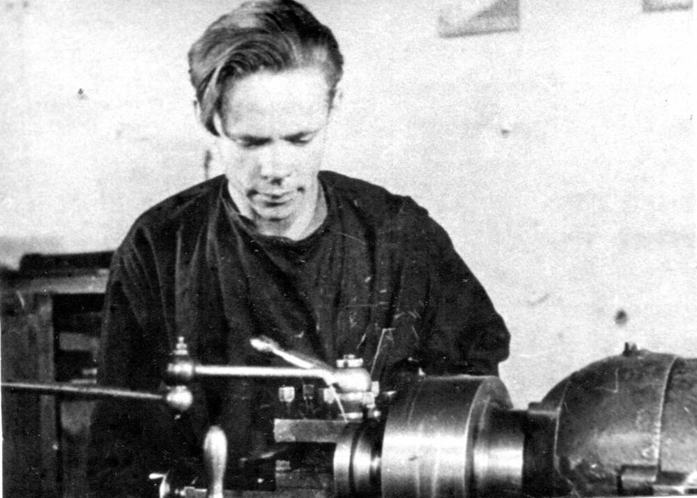 Rīgas eksperimentālās rūpnīcas "Stars" komjauniešu brigādes vadītājs Pjotrs Rogačovs pie darbgalda.