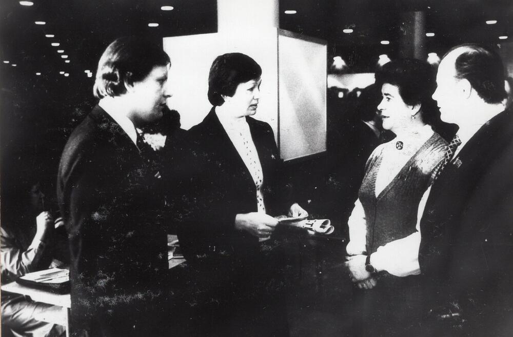 Latvijas PSR Žurnālistu savienības kongresa delegāti. Otrā no kreisās: Valsts elektrotehniskās fabrikas (VEF) regulētāja, Sociālistiskā Darba Varone G. Griņova.