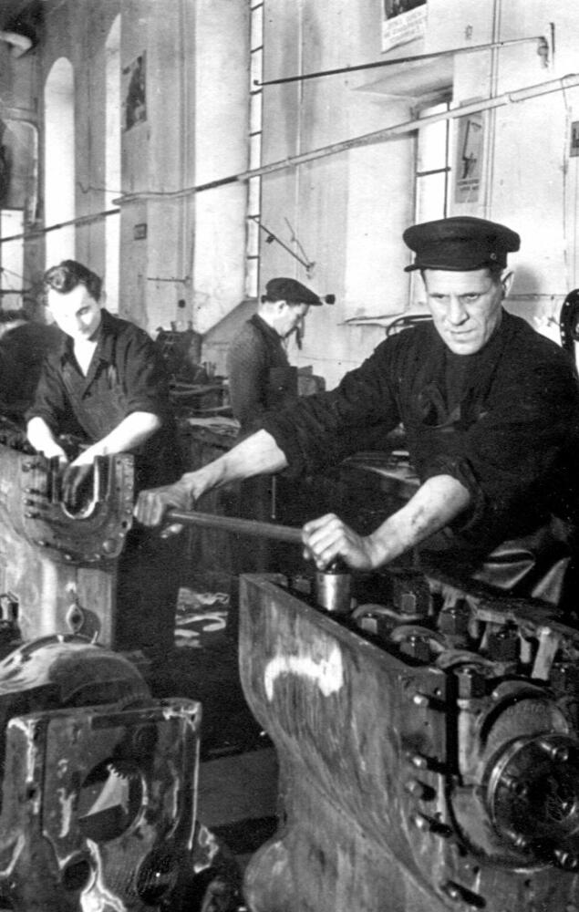 Rīgas eksperimentālās rūpnīcas "Stars" dzinēju montāžas ceha darbinieki. Priekšplānā : montieratslēdznieks P. Staruhins.