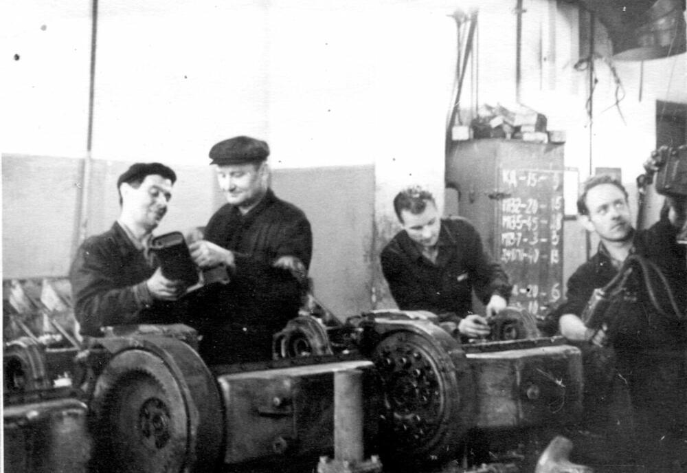 Rīgas eksperimentālās rūpnīcas "Stars" atslēdznieku brigāde darba laikā. No kreisās: Vitālijs Vasiļevskis, Alberts Rimšs, Jānis Dorožkins, Alfrēds Naudžunas.