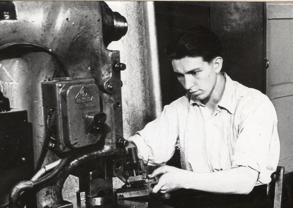 Valsts elektrotehniskā fabrika (VEF). Eksperimentālā ceha atslēdznieks, racionalizators G. Brakanskis pie paša konstruētā automāta.