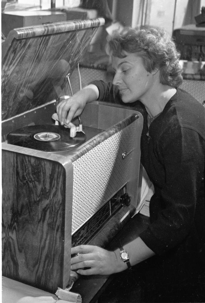 Valsts elektrotehniskā fabrika (VEF). Radio ceha kontroliere J. Sokolovska veic radiolas "Akords" tehniskā stāvokļa kontroli.