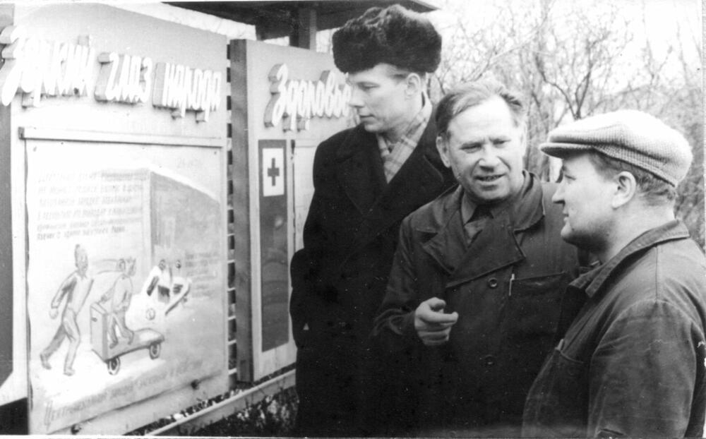 Rīgas eksperimentālā rūpnīca "Stars". Tautas kontroles grupas priekšsēdētājs V. Lobanovs (centrā) ar kolēģiem G. Vizbeli un I. Jurkevicu uzņēmuma teritorijā.