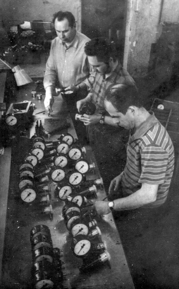 Rīgas eksperimentālā rūpnīca "Stars". Mehāniskā ceha montieratslēdznieku brigādes vadītājs V. Prokofjevs (no labās) ar darba kolēģiem R. Šuļmeisteru un V. Belovu veic manometru montāžu.