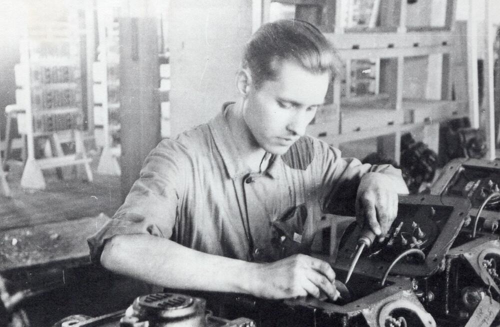 Valsts elektrotehniskās fabrikas (VEF) telefonu montāžas cehs. Montieris, ražošanas pirmrindnieks Pērkons veic telefonu montāžu, kas paredzēti šahtām un ražotnēm ar ekstrēmiem darba apstākļiem.