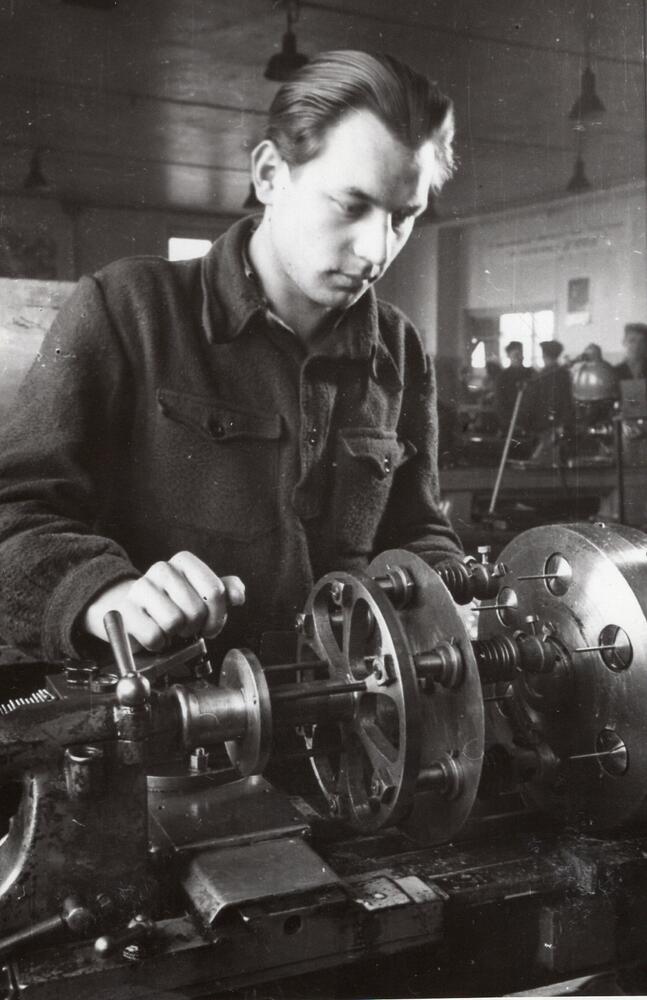 Valsts elektrotehniskās fabrikas (VEF) virpotājs, ražošanas novators V. Mižeckis pie darba galda.