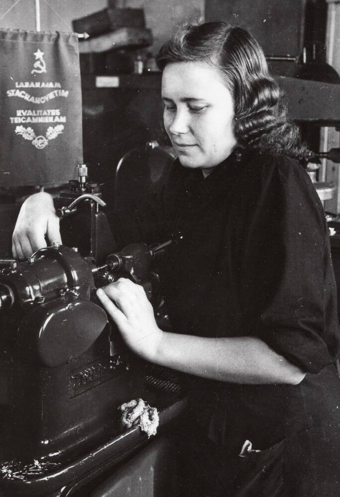 Valsts elektrotehniskā fabrika (VEF). Telefonu montāžas ceha montiere, ražošanas pirmrindniece Monika Štekele darba laikā.
