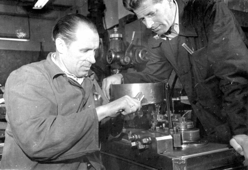 Valsts elektrotehniskās fabrikas (VEF) ražošanas novatori. No kreisās: atslēdznieks Dubrovskis un tehnoloģiskā biroja vadītājs Galiņš darba laikā.